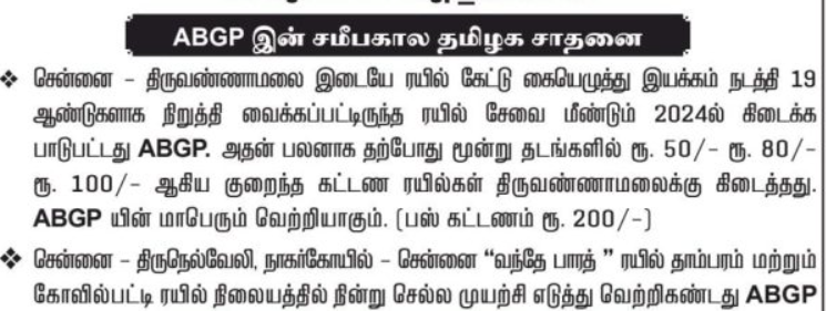 ஜூலை 28, தென்னக ரயில்வே AGM திரு.கெளசல் கிஷோர் ஐ சந்தித்து, திருவண்ணாமலை ரயில் முனையம் வர ரயில்வே முயற்சிக்கு ABGP பாராட்டு தெரிவித்தது.திருச்செந்தூருக்கும் அதிக ரயில்வசதி ஏற்பட, ஆறுமுகனேரியை ரயில் முனையமாக்கவும் கோரிக்கை அளிக்கப்பட்டது.