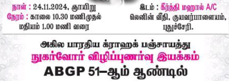 நவம்பர் 10ஆம் தேதி ஞாயிற்றுக்கிழமை மாலை திருச்சி ஸ்ரீரங்கம் ஸ்ரீமத் ஆண்டவன் கலை மற்றும் அறிவியல் கல்லூரியில் நடைபெற்ற, அகில பாரதிய க்ராஹக் பஞ்சாயத்து, நுகர்வோர் இயக்கம் 51ஆம் ஆண்டு துவக்கவிழா நிகழ்வாக பல்வேறு மாவட்டங்களில் நுகர்வோர் விழிப்புணர்வு தலைப்புகளில் நடந்த…
